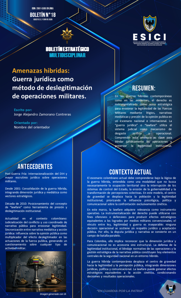 En las guerras híbridas contemporáneas como en las modernas, el derecho es instrumentalizado como arma estratégica para erosionar la legitimidad de las Fuerzas Militares mediante litigios, narrativas mediáticas y presión de la opinión publica en un escenario nacional e internacional. La “guerra jurídica” o “lawfare” utiliza el sistema judicial como mecanismo de desgaste político y operacional.